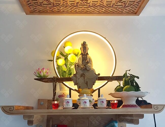 - Tuyệt đối không thờ chung: Bàn thờ Phật phải tách biệt hoàn toàn với bàn thờ gia tiên, Thần Tài – Ông Địa. Theo nguyên tắc, Phật đặt cao nhất, sau đó đến bàn thờ gia tiên (cũng đặt cao), và cuối cùng là bàn thờ Thần Tài (dưới đất). Không được đặt tượng Phật thấp hơn hoặc cùng cấp với bài vị gia tiên.